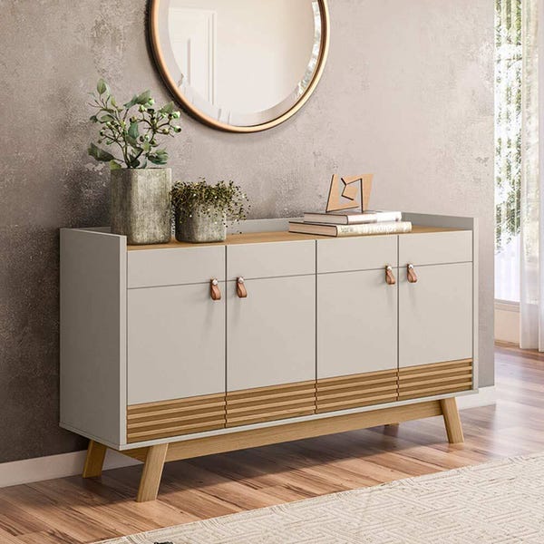 Produzido em MDP, 4 Portas de Bater com Detalhes Ripados, Dobradiças Metálicas e Puxadores em Couro, 1 Prateleira Interna e Pés em Estilo Retrô de MDF, com as medidas: Altura: 88 cm x Largura: 160 cm x Profundidade: 43 cm