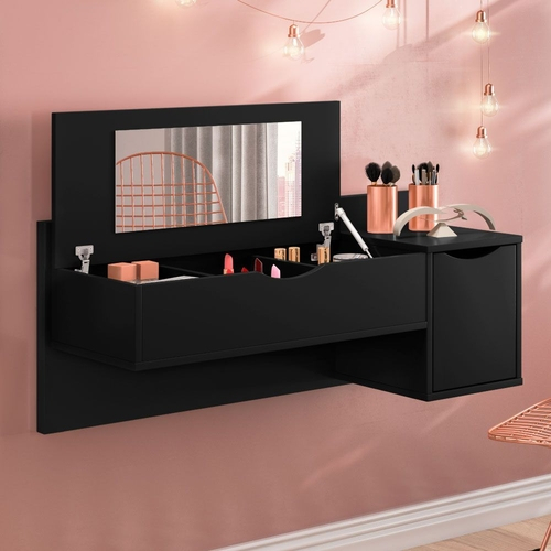 | MATERIAL | Estrutura 100% MDP, com 2 Portas, sendo uma Basculante com Pistão a Gás e uma de Bater, ambas com Dobradiças Metálicas, 3 Nichos para Objetos Pessoais e Maquiagens e Espelho 46cm x 20cm. |