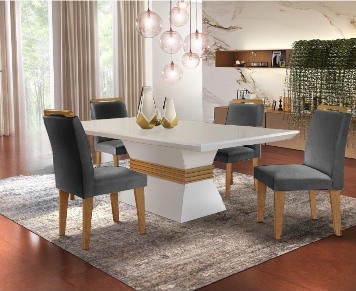 Mesa Ágata 120 Canto Copo Off White/Imbuia com 4 Cadeiras Athenas Cinza – RUFATO