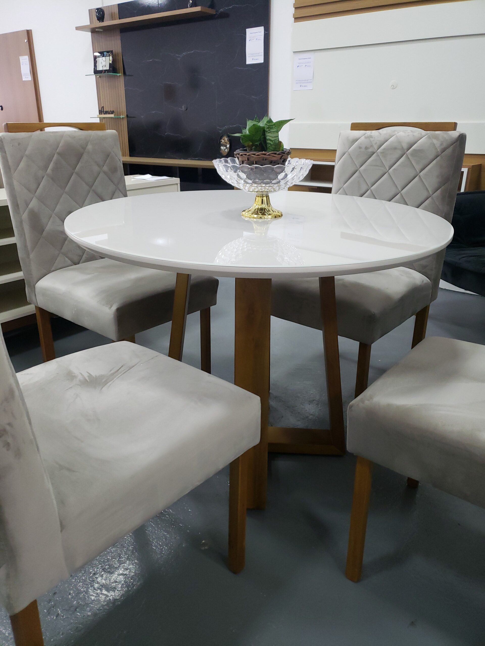 Conjunto Sala de Jantar com Mesa Natale, Diamentro de 1 Metro e 4 Cadeiras Cristal na cor Imbuia e Tecido Veludo Medidas da Mesa: Medidas montado (AlturaxDiamentro): 78cm x 1,00cm Base produzida em madeira maciça e Tampo em mdf de 25 mm com vidro laqueado de 4mm no padrão off White. Medidas da Cadeira: Medidas montado (AxLxP): 102cm x 47cm x 56cm, Produzido em Madeira Maciça de Liptus tratado, 100% imunizado e seco em estufa. Cadeiras serão entregues montadas Mesa entregue semi-montada ( Fixar o tampo na base).