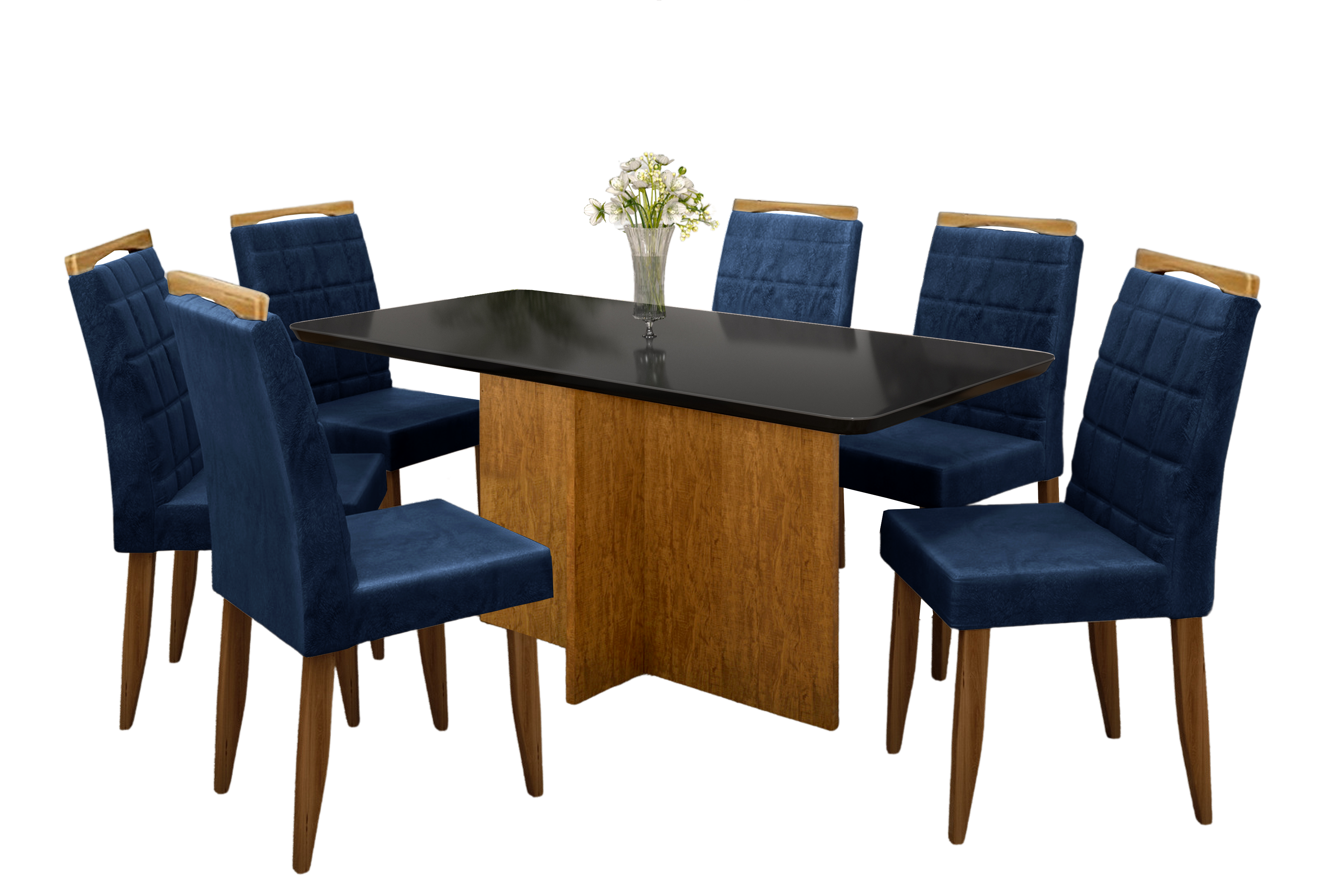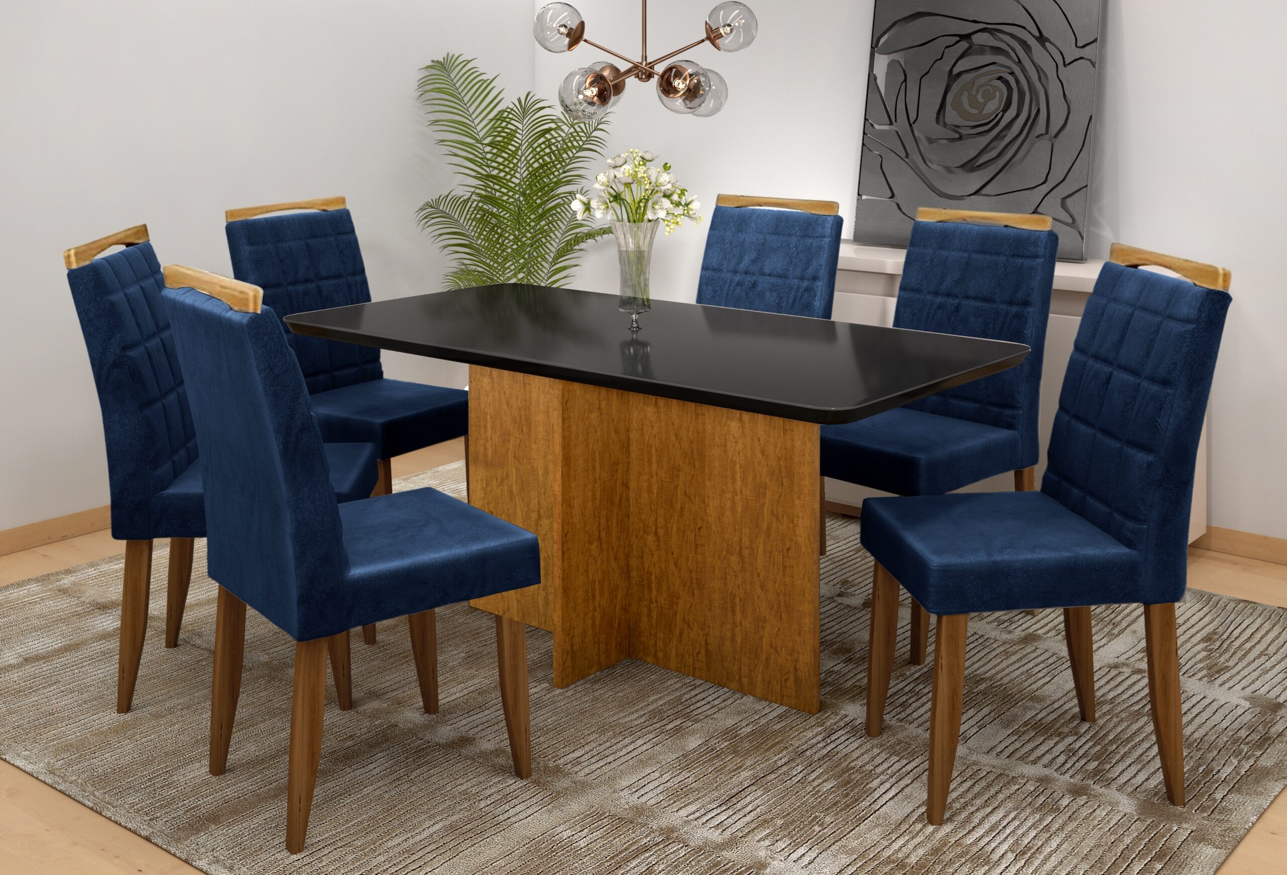 Mesa Los Angeles Canto Copo 80×160 Cinamono/Preto com 6 Cadeiras Las Vegas Azul – MINASPLAC