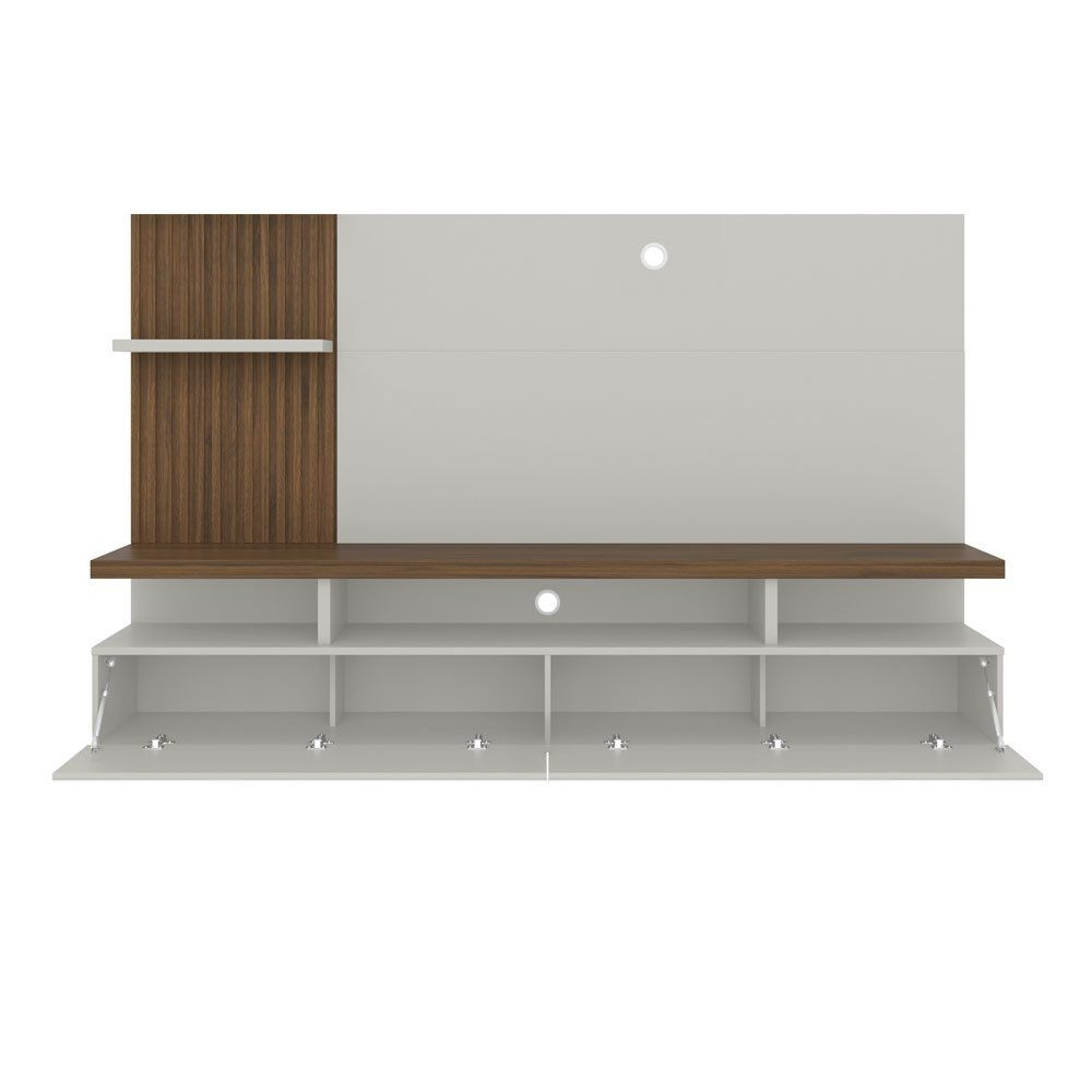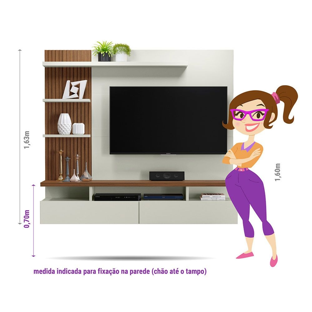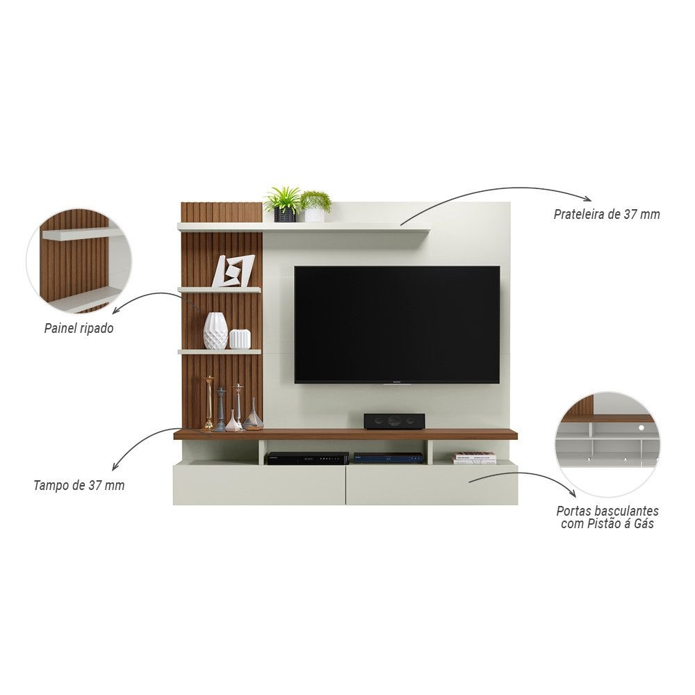 Sua TV ficará mais atraente no Painel Home Vitória! Com um espaço para TV de até 60 polegadas (espaço útil para TV no painel: 1,36 m de larg. x 1,03 m de alt. x 0,29 m de prof. ) , você poderá assistir a seus programas favoritos com toda a sua família sem se preocupar com os outros aparelhos eletrônicos que podem ser dispostos em seus três nichos inferiores. Além disso, possui duas portas basculantes, onde você poderá deixar seus objetos que não precisam ficar à mostra! O Painel Home Vitória conta ainda com três prateleiras superiores para que você possa colocar suas decorações preferidas! Seus detalhes no ripado e seu tampo engrossado deixam sua sala com design moderno e elegante.