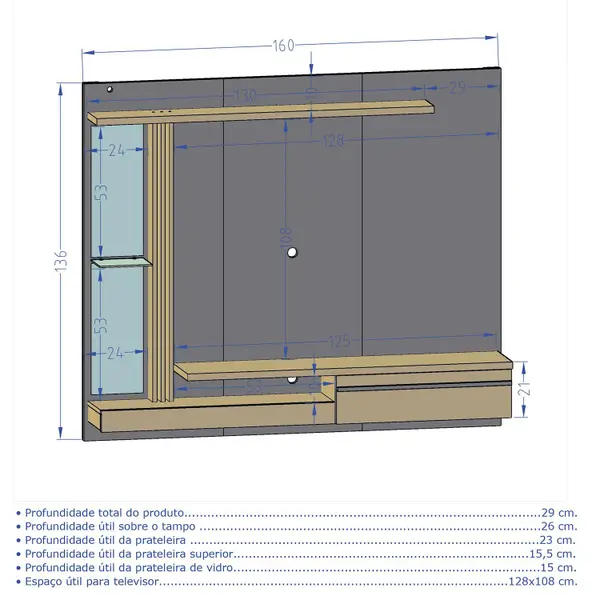 | Informações Complementares | Elaborado em MDP, sendo tampo e prateleira superior em 25mm e base, laterais, prateleiras e porta em MDP de 15mm. Prateleira de vidro 6mm com suportes metálicos e dobradiças metálicas. Kit Luminária LED elétrico bivolt com interruptor on/off. Acabamento d |