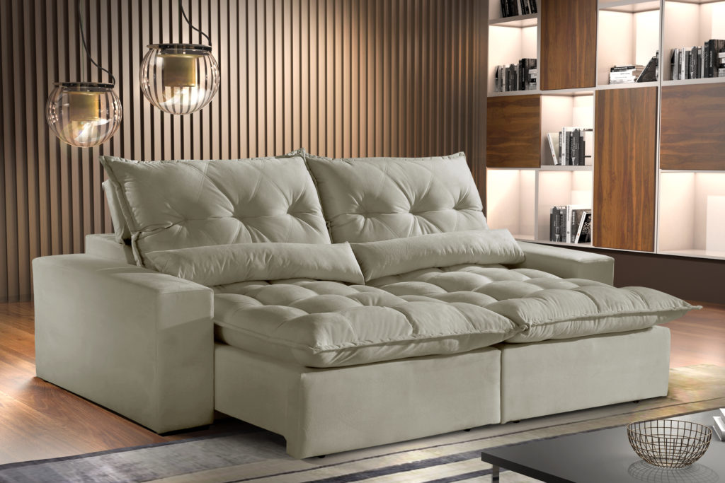 | MATERIAL | Sua estrutura em madeira de reflorestamento ecologicamente correto Seca e imunizada, Retrátil com pillow preenchido com fibra siliconada com 18 cm de altura, Percintas Italianas, Molas Bonel, Revestimento com manta acrílica, reclinável em 4 posições, pillow top com 18cm, Almofadas/rineiras não inclusas |